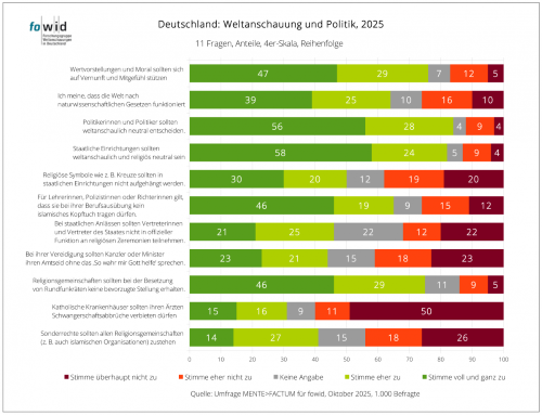 Das Meinungsforschungsinstitut »Mentefactum« hat im Auftrag von fowid in der ersten Oktoberhälfte eine repräsentative Bevölkerungsumfrage durchgeführt, die nun auf der Website der Forschungsgruppe ausgewertet wurde. »Die Ergebnisse der Umfrage verdeutlichen«, so die fowid-Autoren, »wie weit der Prozess der Säkularisierung in Deutschland vorangeschritten ist.« Dies zeige sich sowohl mit Blick auf die weltanschaulichen Haltungen der Bürgerinnen und Bürger als auch hinsichtlich ihrer Einstellungen zur Neutralität des Staates und seinem Verhältnis zu den Religions- und Weltanschauungsgemeinschaften.
