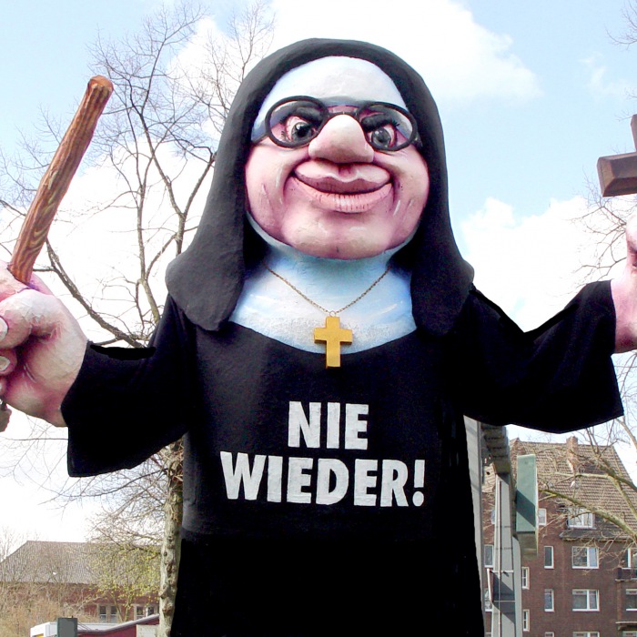 Jacques Tillys "Prügelnonne", die auf der Demonstration der ehemaligen Heimkinder in Berlin für internationale Aufmerksamkeit sorgte, fährt zum Ökumenischen Kirchentag nach München.